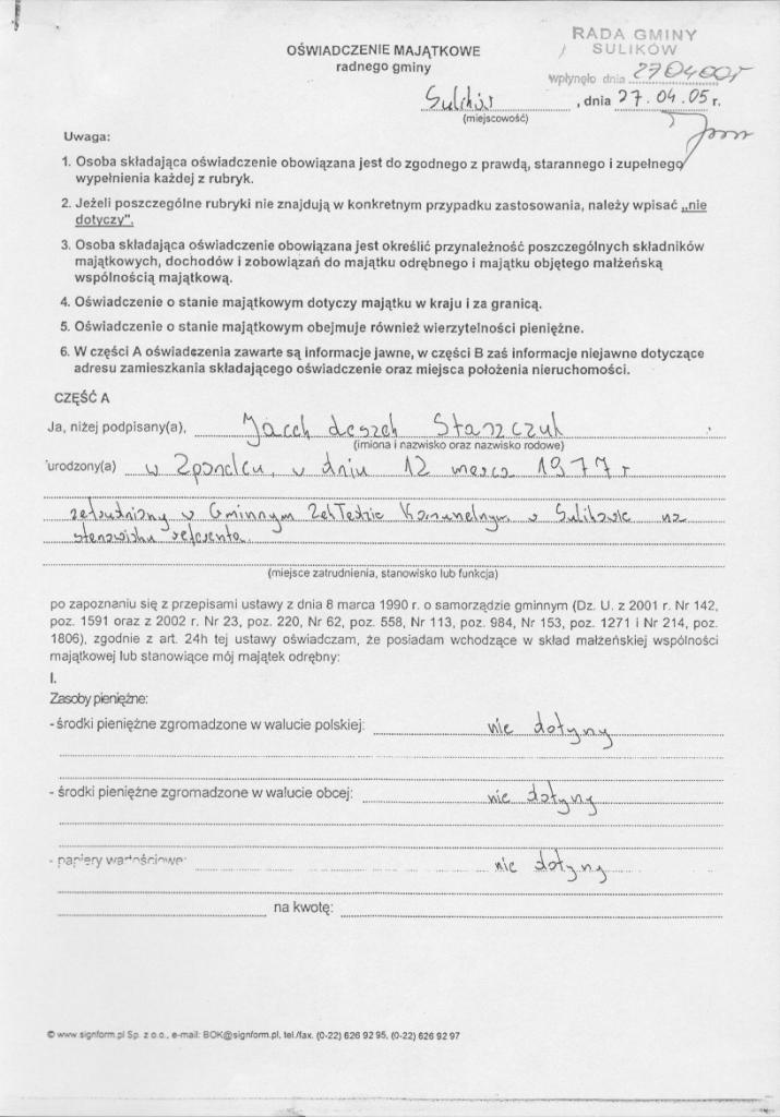 | Skrócony opis: | OŚWIADCZENIE MAJĄTKOWE RADNEGO GMINY SULIKÓW |