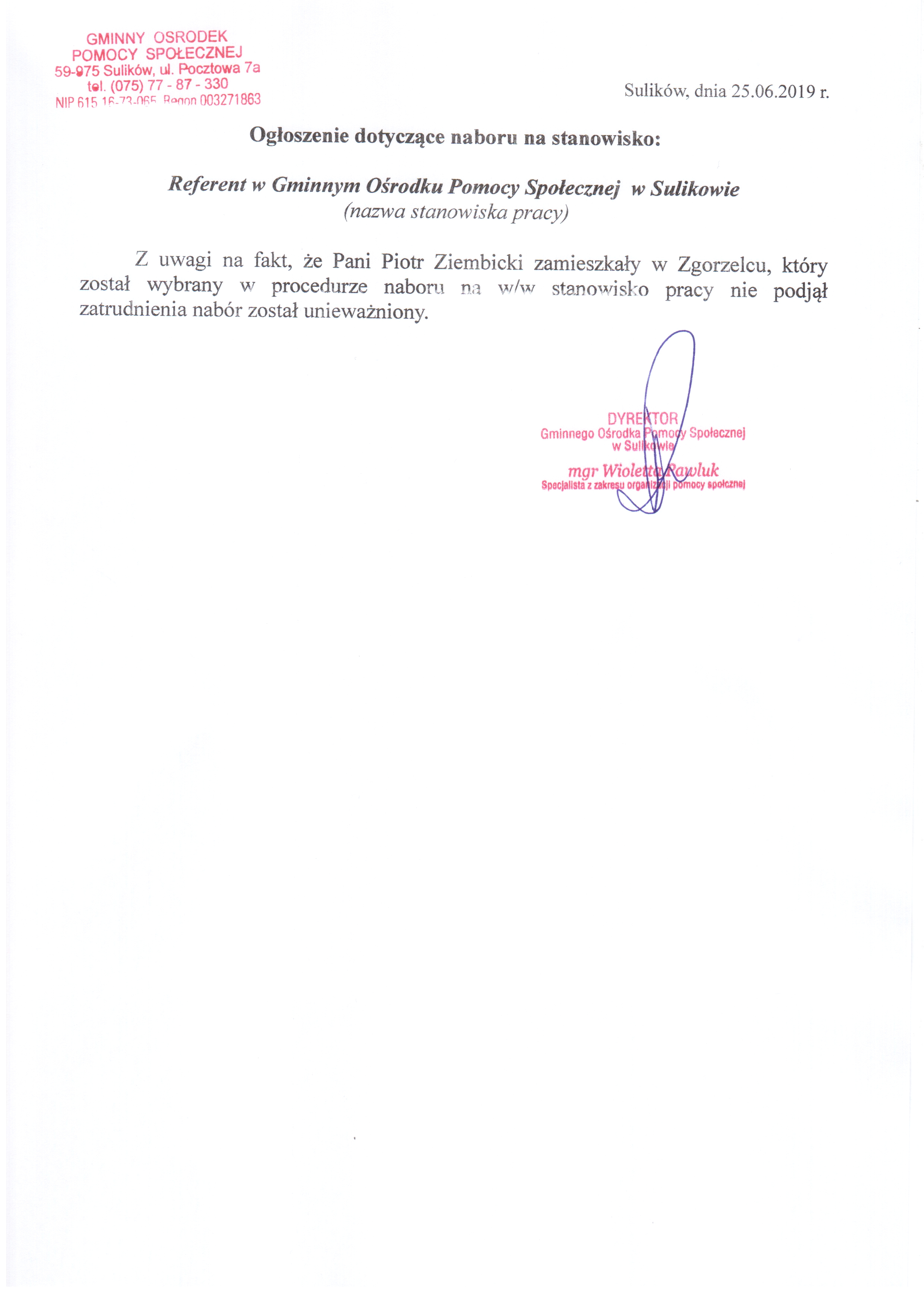 | Skrócony opis: | Dyrektor Gminnego Ośrodka Pomocy Społecznej w Sulikowie ogłasza nabór na stanowisko urzędnicze „Referent” w Gminnym Ośrodku Pomocy Społecznej w Sulikowie |