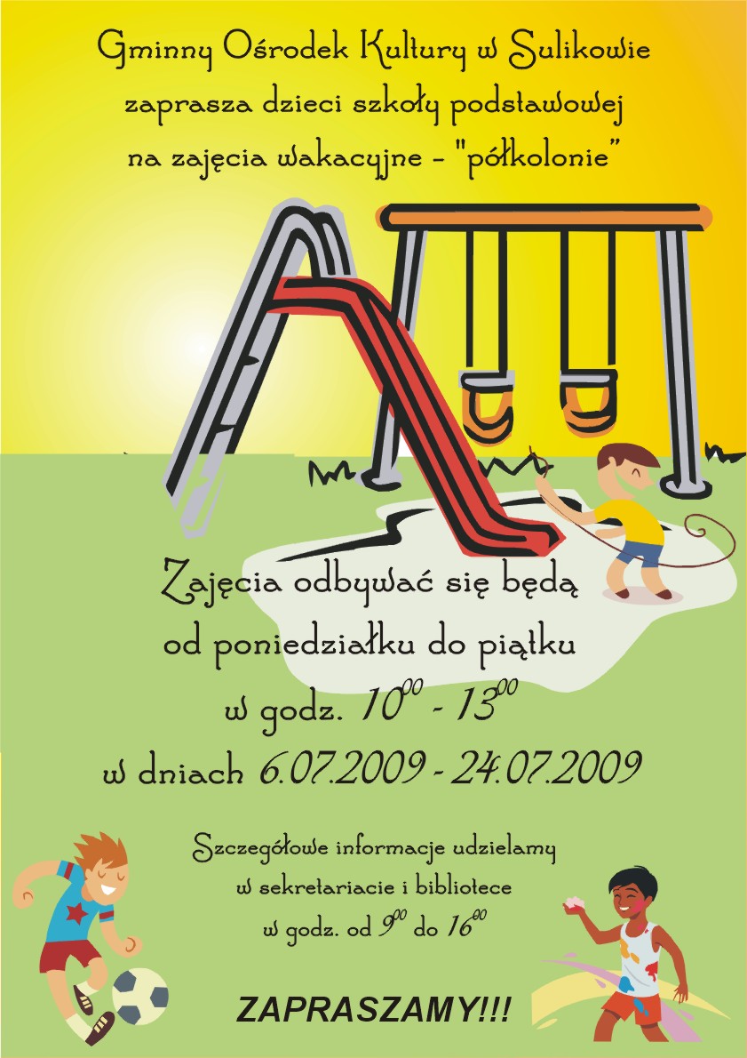 | Nazwa dokumentu: | Półkolonie letnie | | Osoba, która wytworzyła informację: | Jaworski Zbigniew | | Osoba, która odpowiada za treść: | Jaworski Zbigniew | | Osoba, która wprowadzała dane: | Warchoł Tomasz | | Data wytworzenia informacji: | 2009-06-19 17:16:48 | | Data udostępnienia informacji: | 2009-06-19 17:16:48 | | Data ostatniej aktualizacji: | 2009-06-19 17:18:49 |
