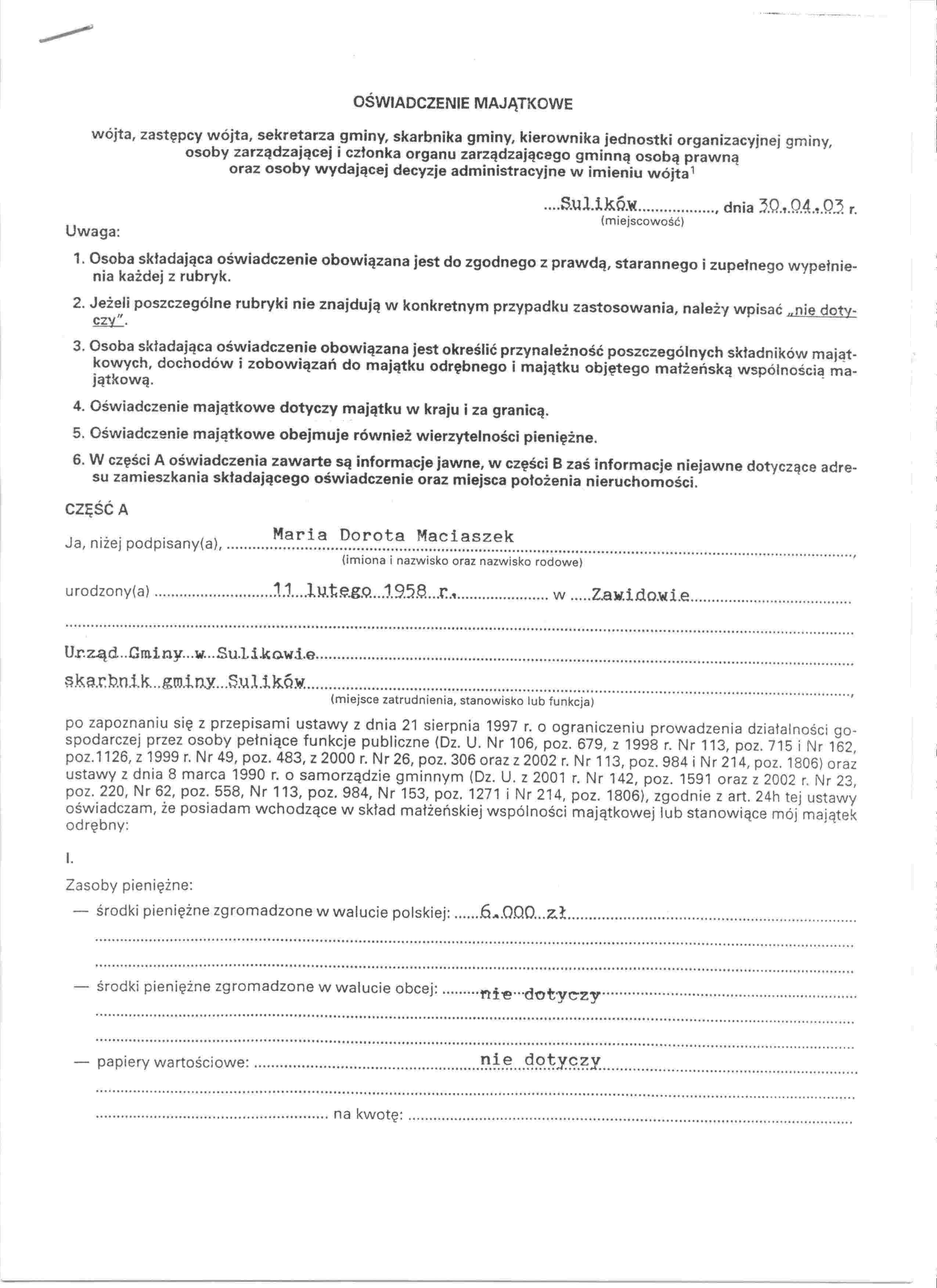 | Skrócony opis: | OŚWIADCZENIE MAJĄTKOWE SKARBNIKA GMINY SULIKÓW |