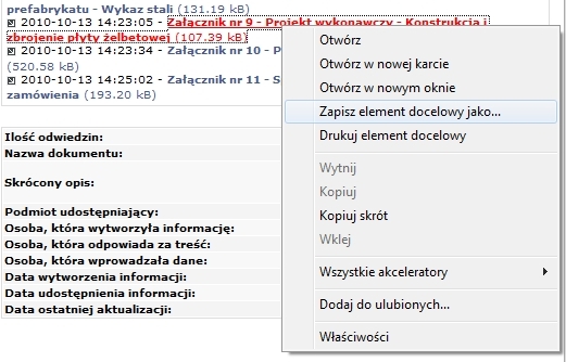 W momencie zainstalowania programu i próbie otworzenie załącznika graficznego może pojawić się problem z jego wyświetleniem. Należy wtedy po najechaniu kursorem na załącznik nacisnąć prawy przycisk myszy i wybrać pozycje: " Zapisz element docelowy jako... " i zapisać załącznik na dysk twardy. Dopiero wtedy będzie możliwe prawidłowe obejrzenie załącznika. Poniżej rysunek podglądowy.