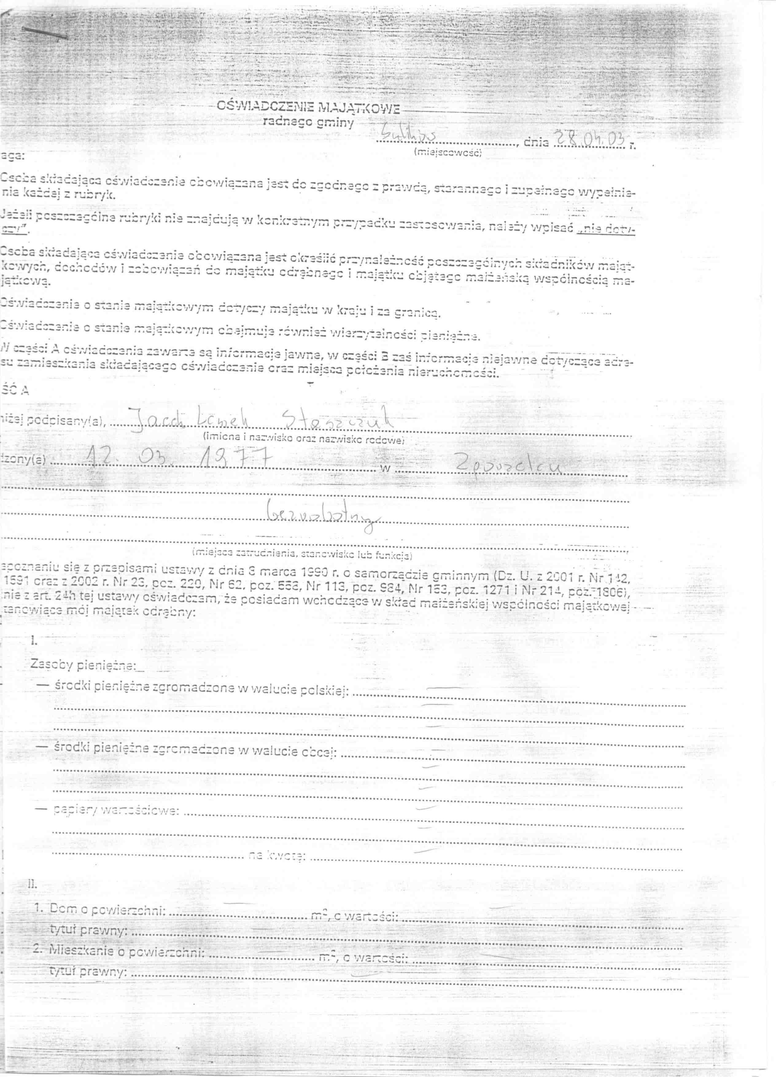 | Skrócony opis: | OŚWIADCZENIE MAJĄTKOWE RADNEGO GMINY SULIKÓW |