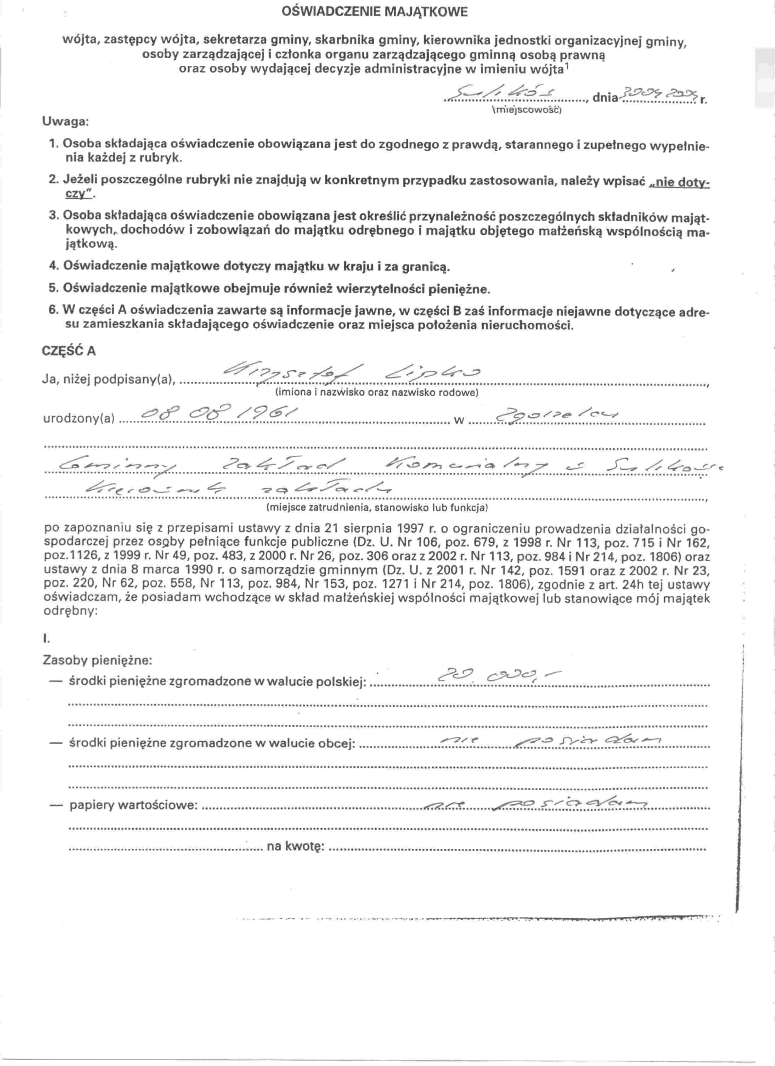 | Skrócony opis: | OŚWIADCZENIE MAJĄTKOWE DYREKTORA GMINNEGO ZAKŁADU KOMUNALNEGO W SULIKOWIE |