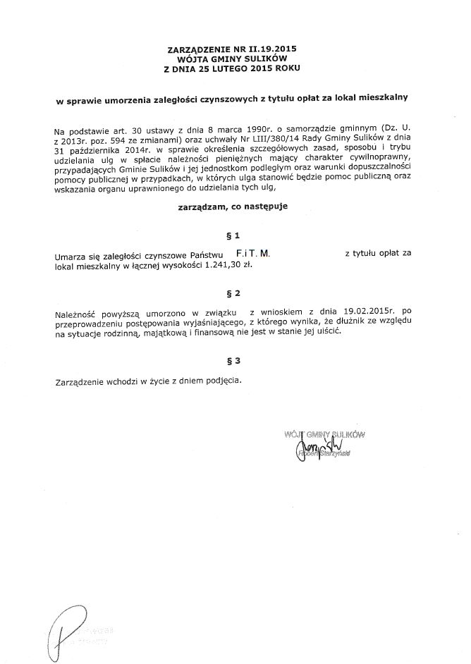 | Skrócony opis: | W sprawie umorzenia zaległości czynszowych z tytułu opłat za lokal mieszkalny. |