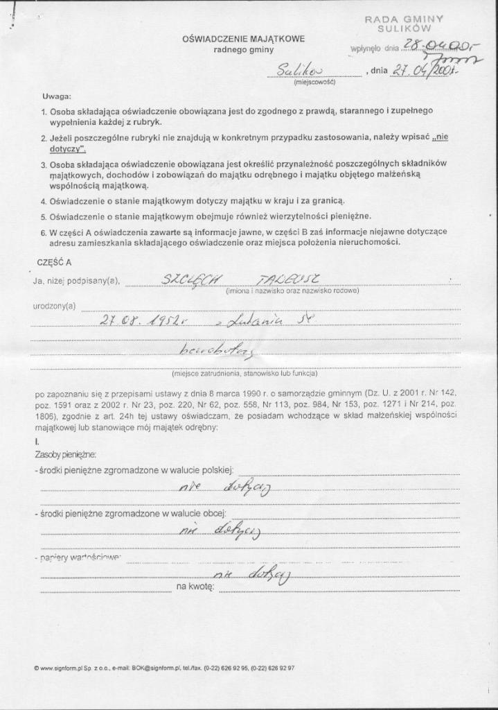 | Skrócony opis: | OŚWIADCZENIE MAJĄTKOWE RADNEGO GMINY SULIKÓW