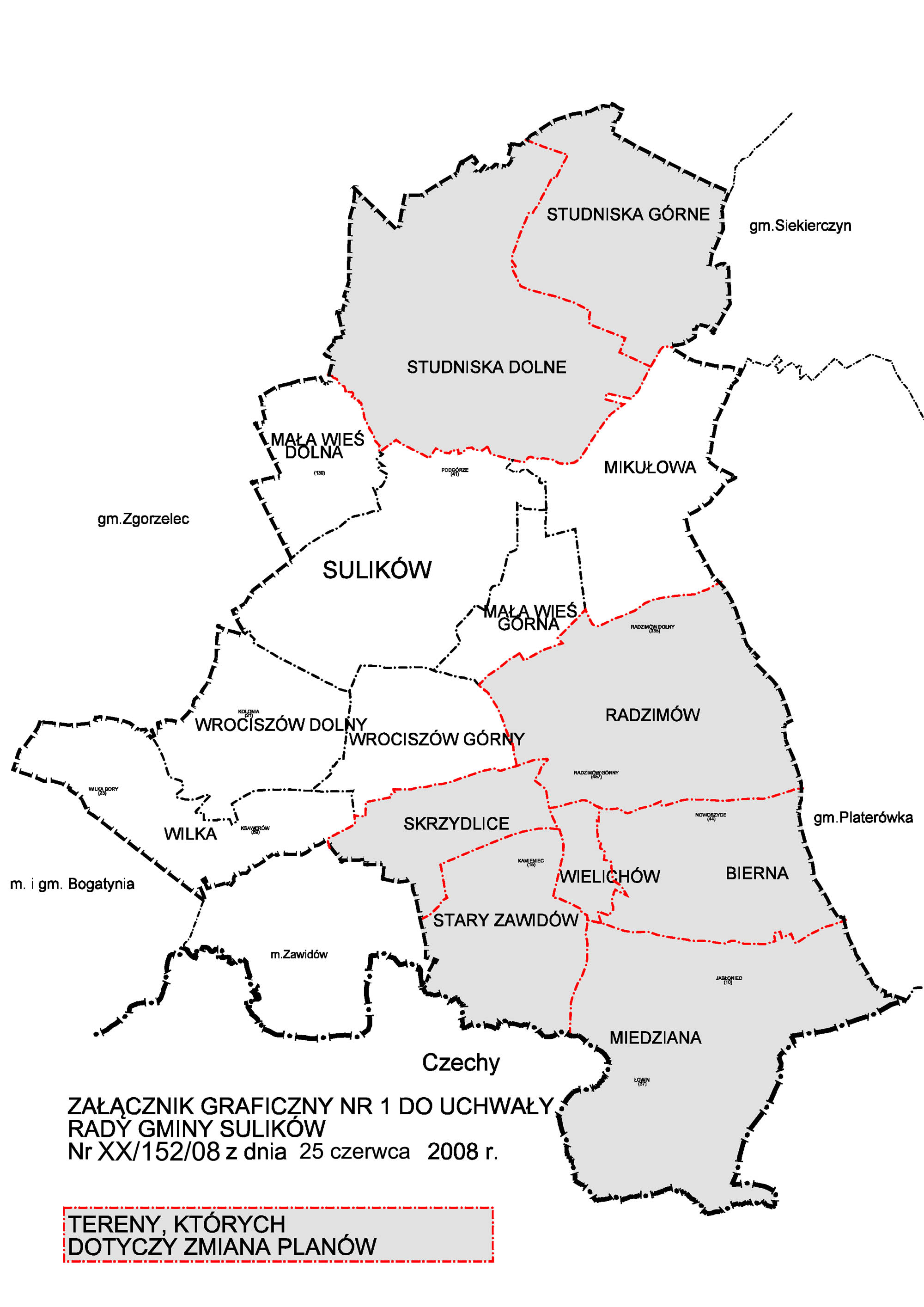 „Ocena ...” w części dotyczącej miejscowych planów zagospodarowania przestrzennego (mpzp) została przyjęta uchwałą RG Nr VIII/60/07 z dnia 30 maja 2007 r. Realizując przyjęty tym samym program prac planistycznych Rada Gminy podjęła 26 września br uchwałę Nr XI/78/07 w sprawie przystąpienia do opracowania zmiany mpzp 8 obrębów: Bierna, Miedziana, Radzimów, Skrzydlice, Stary Zawidów, Studniska Dolne, Studniska Górne i Wielichów w Gminie Sulików.