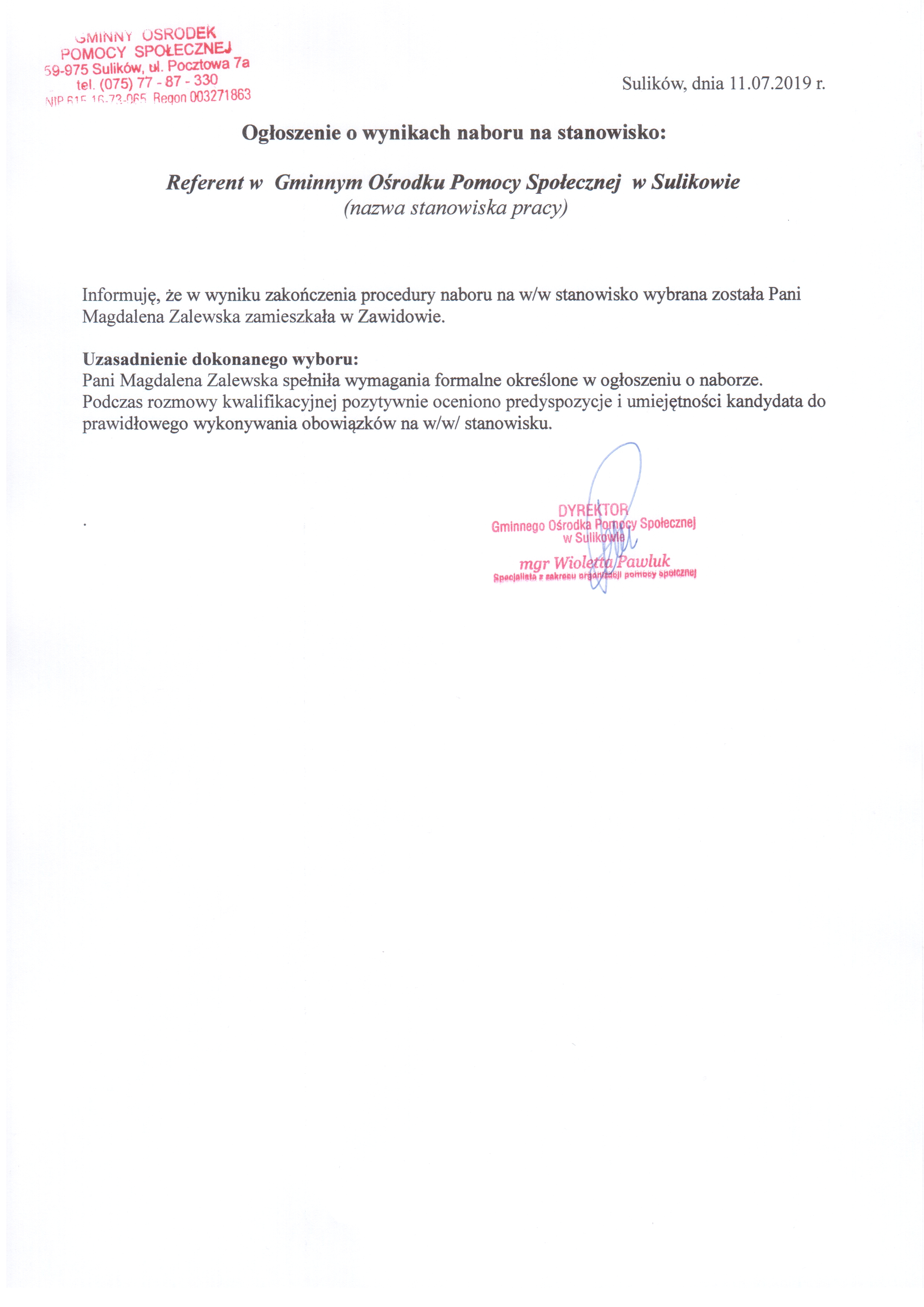 Dyrektor Gminnego Ośrodka Pomocy Społecznej w Sulikowie ogłasza nabór na stanowisko urzędnicze „Referent” w Gminnym Ośrodku Pomocy Społecznej w Sulikowie |