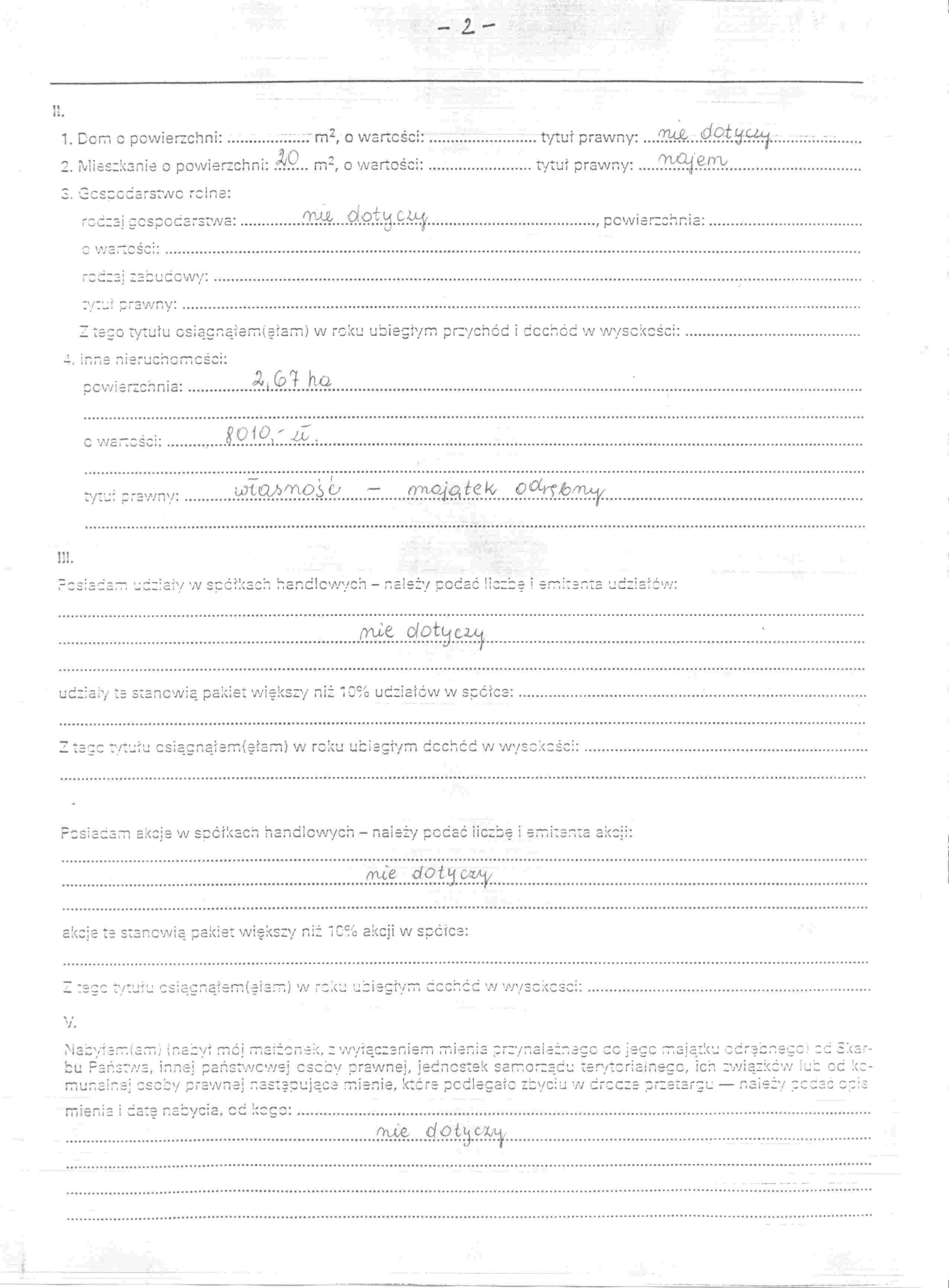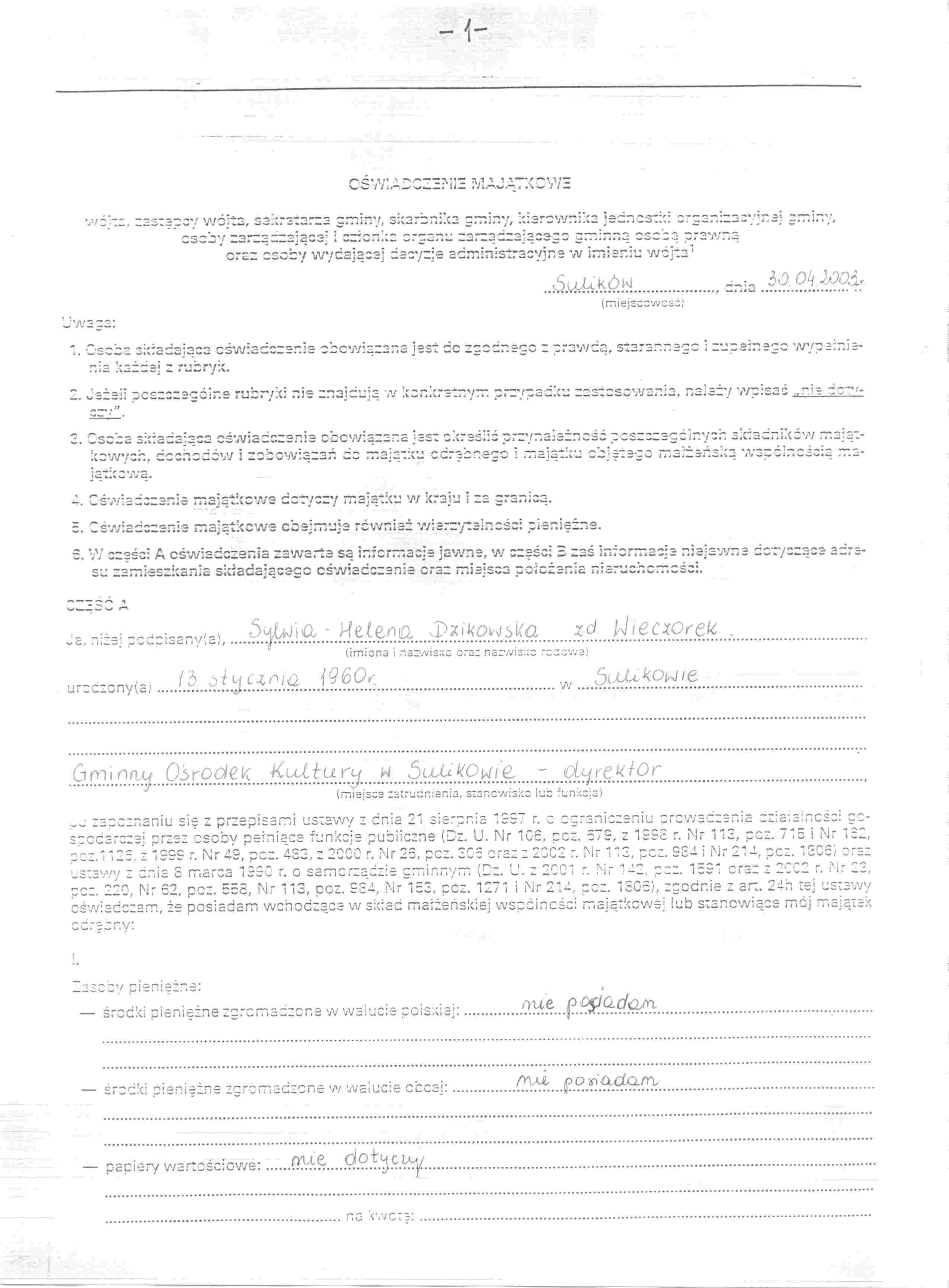 Skrócony opis: OŚWIADCZENIE MAJĄTKOWE DYREKTORA GMINNEGO OŚRODKA KULTURY W SULIKOWIE