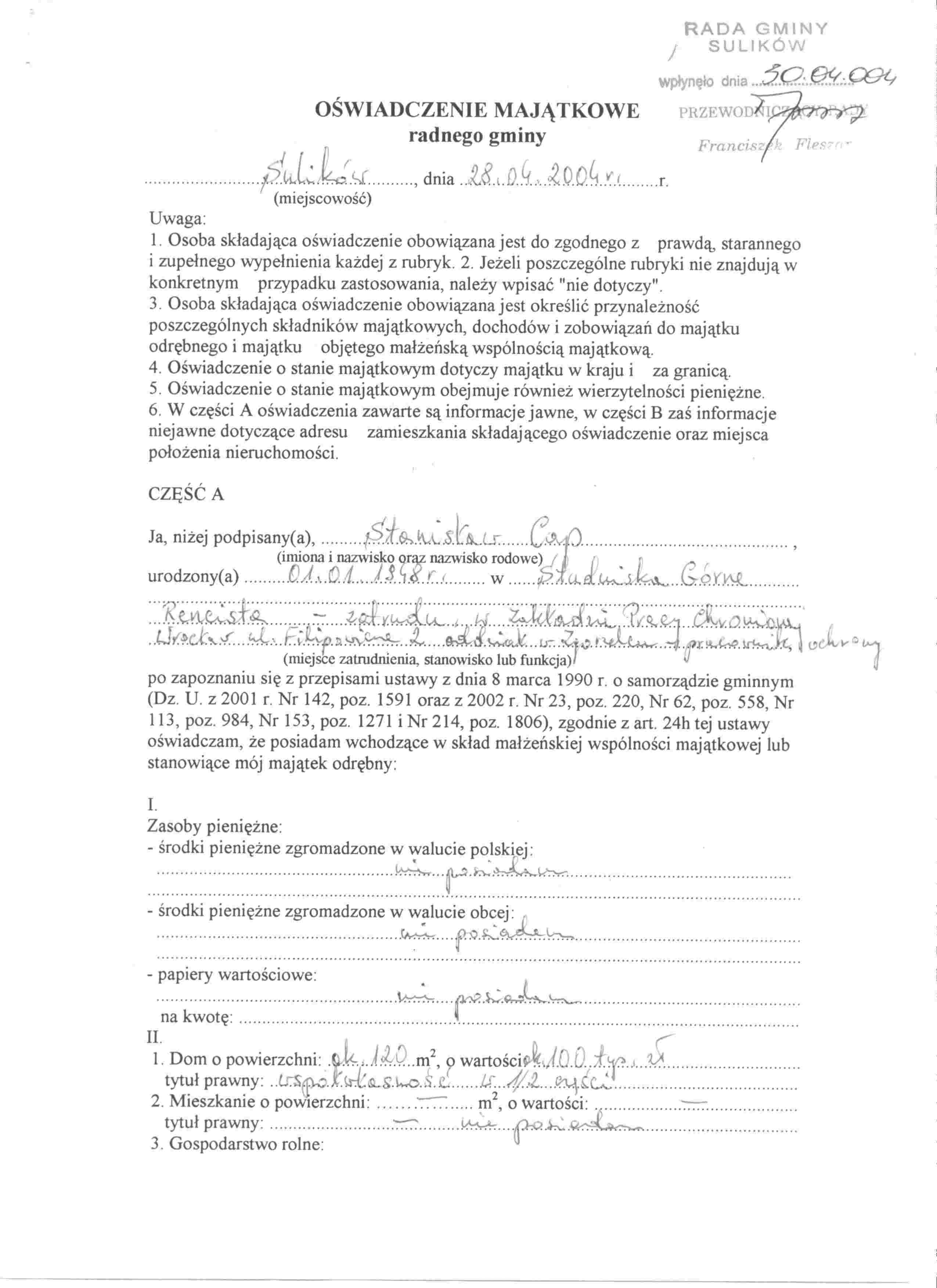 | Skrócony opis: | OŚWIADCZENIE MAJĄTKOWE RADNEGO GMINY SULIKÓW |