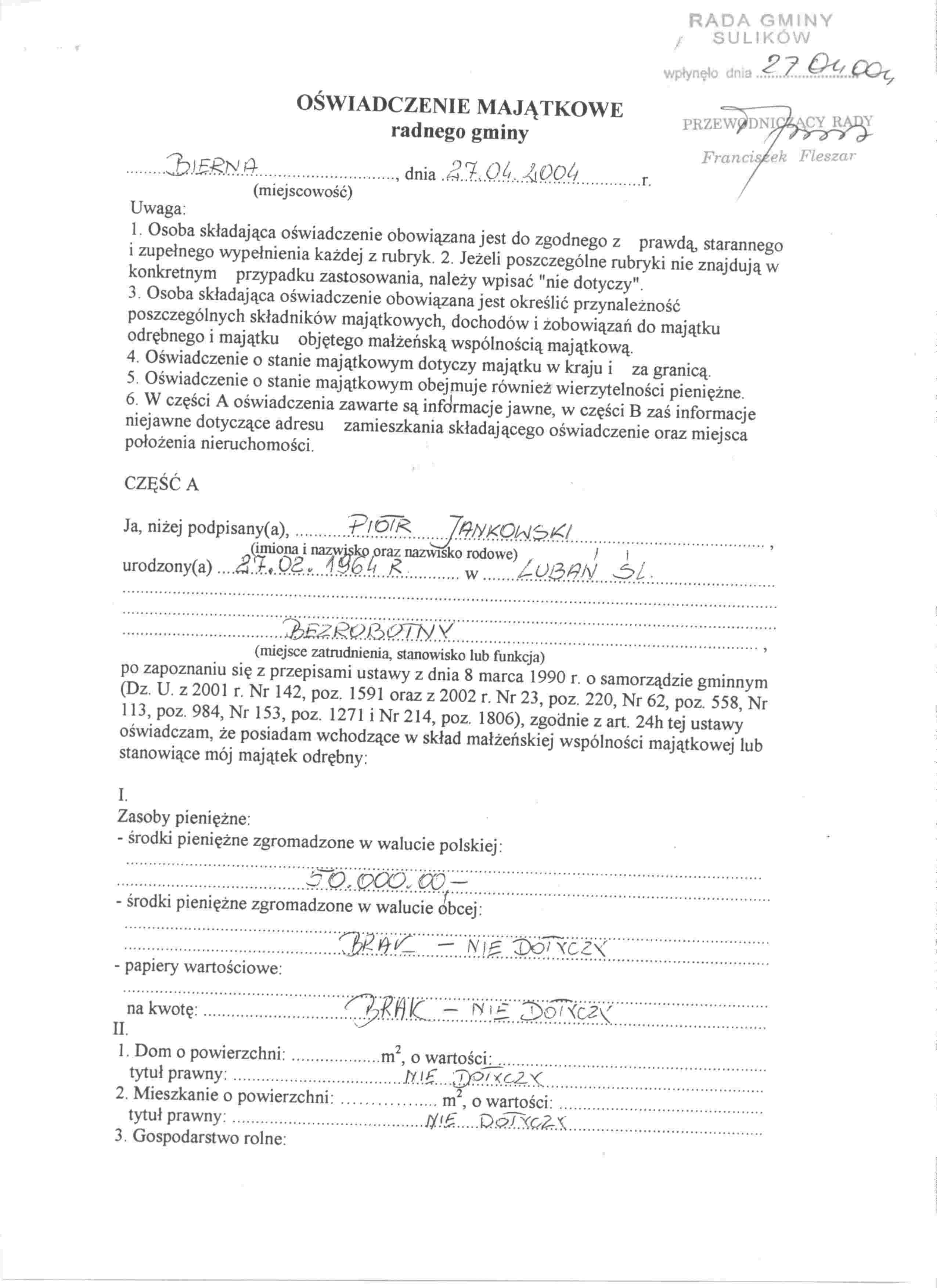 | Skrócony opis: | OŚWIADCZENIE MAJĄTKOWE RADNEGO GMINY SULIKÓW |