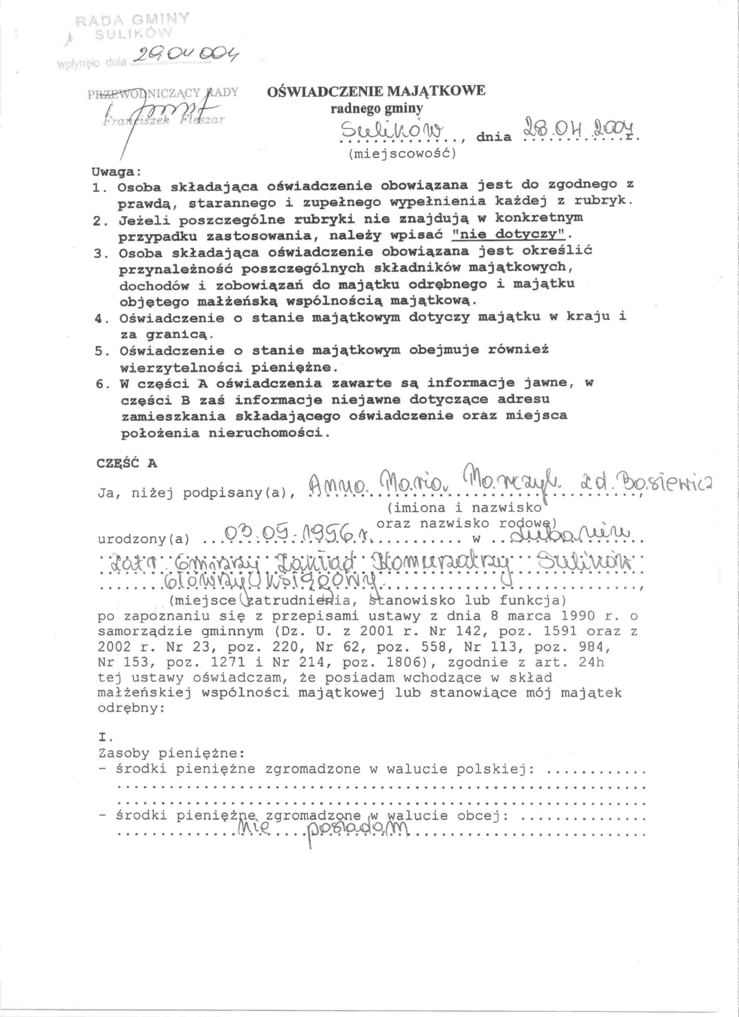 | Skrócony opis: | OŚWIADCZENIE MAJĄTKOWE RADNEJ GMINY SULIKÓW