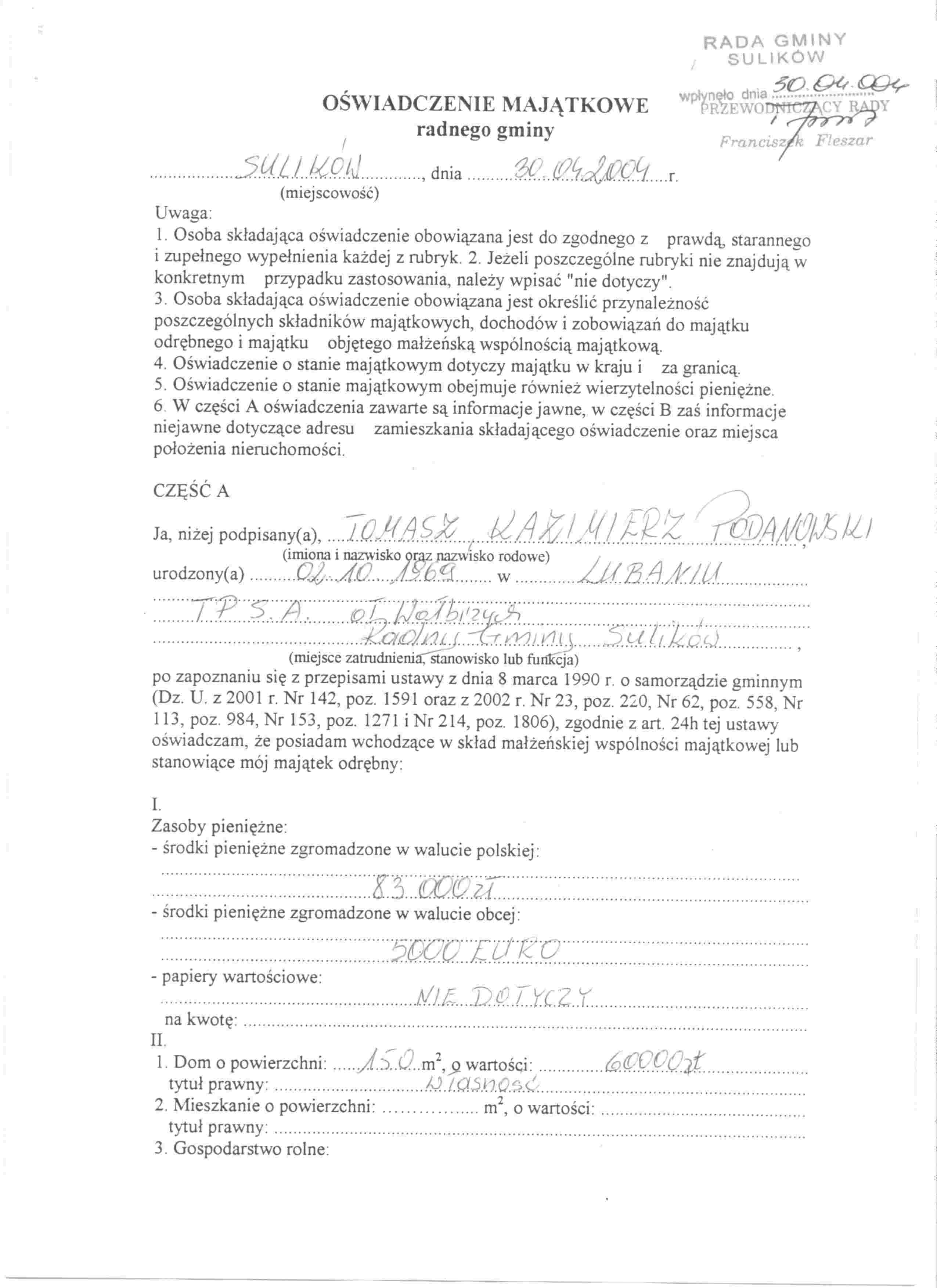 | Skrócony opis: | OŚWIADCZENIE MAJĄTKOWE RADNEGO GMINY SULIKÓW |