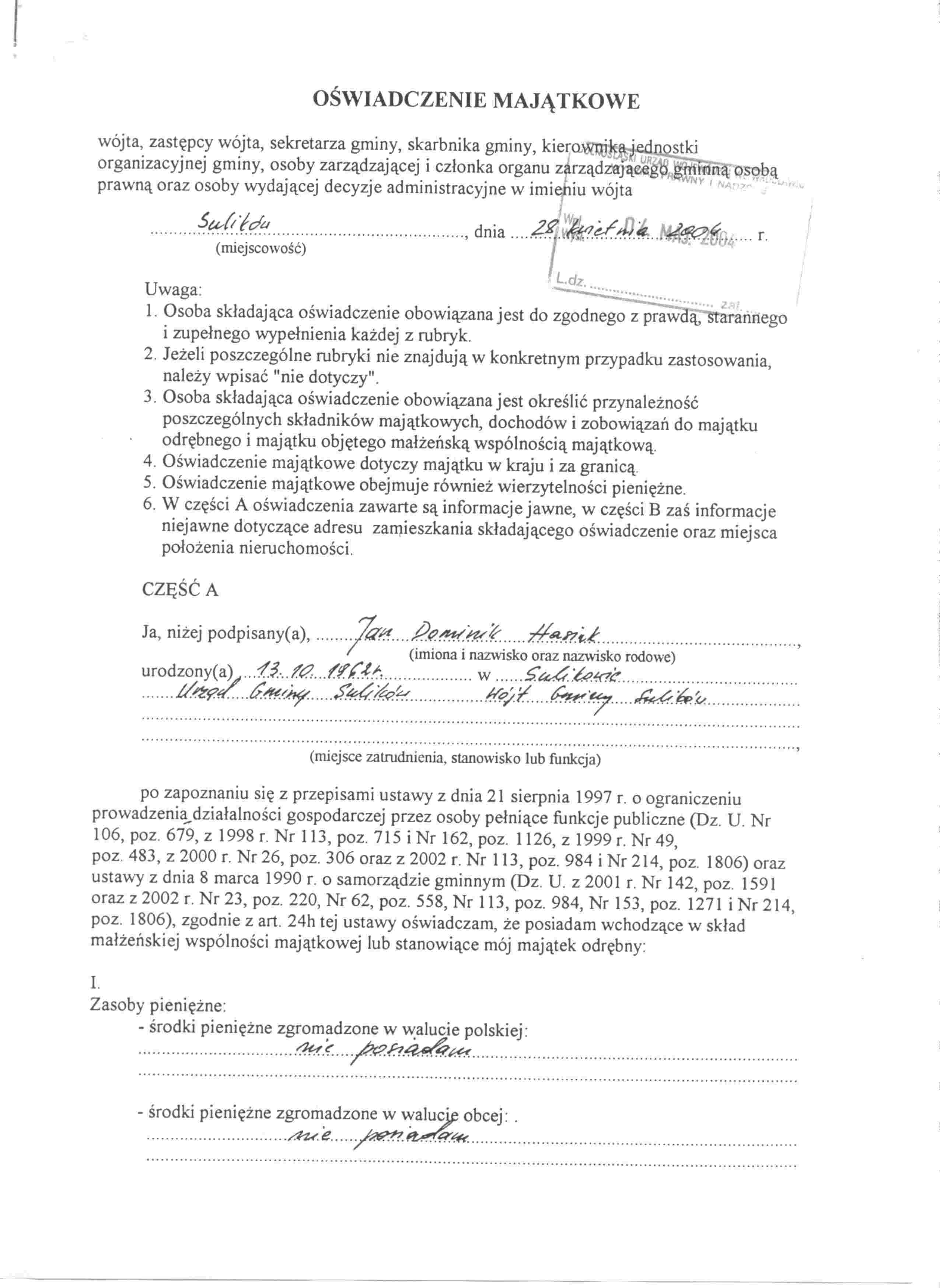 | Skrócony opis: | OŚWIADCZENIE MAJĄTKOWE WÓJTA GMINY SULIKÓW