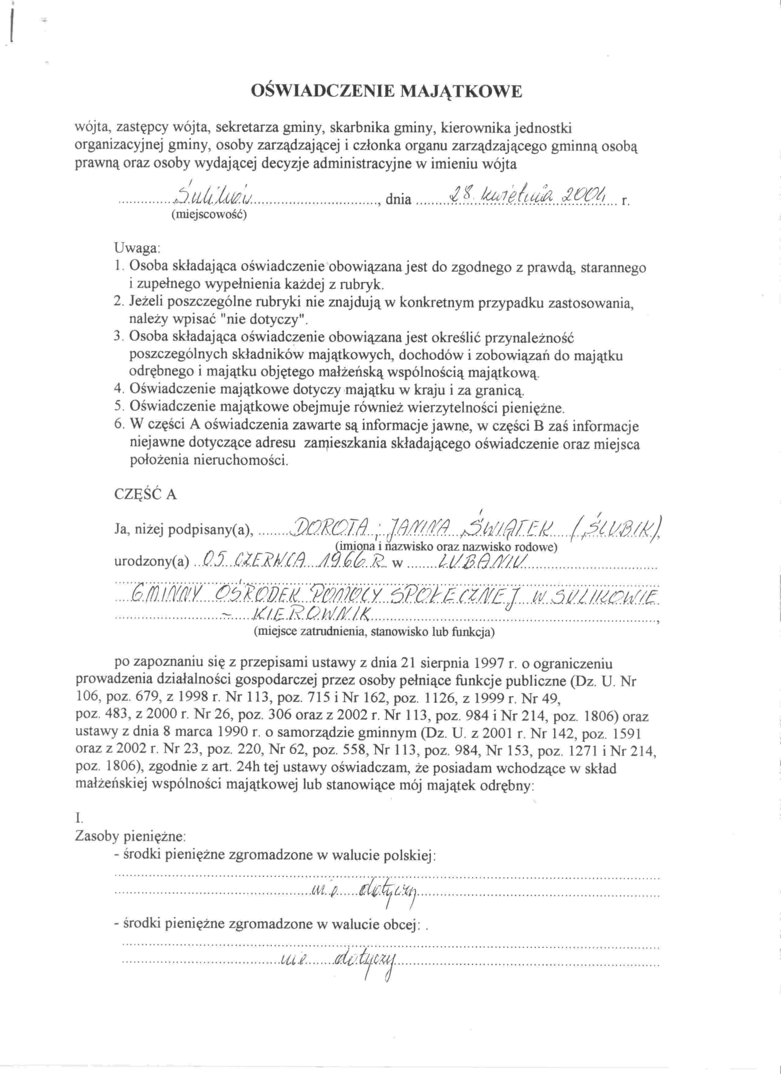 | Skrócony opis: | OŚWIADCZENIE MAJĄTKOWE DYREKTORA GMINNEGO OŚRODKA POMOCY SPOŁECZNEJ W SULIKOWIE |