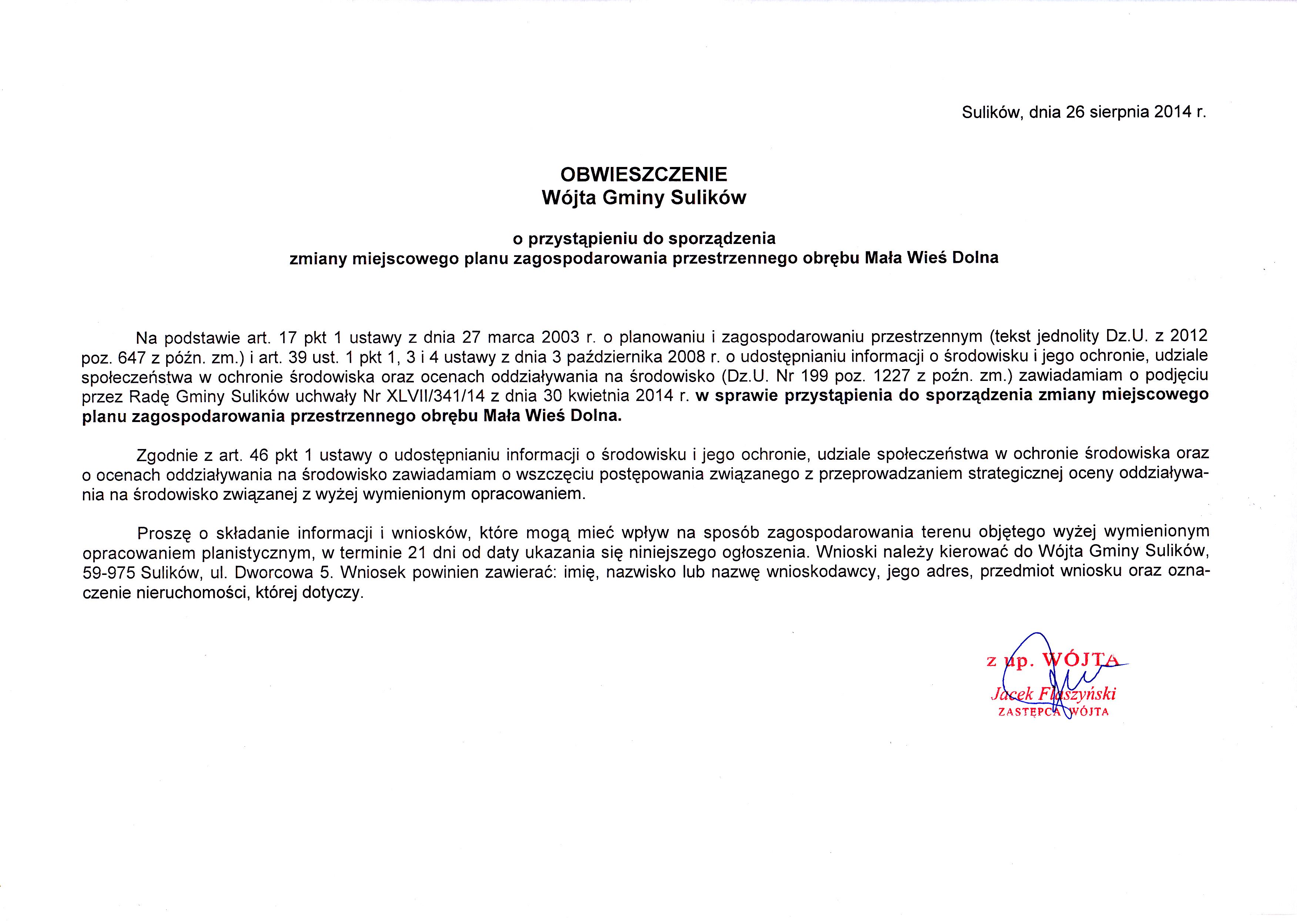 | Skrócony opis: | O przystąpieniu do sporządzenia zmiany miejscowego planu zagospodarowania przestrzennego obrębu Mała Wieś Dolna |